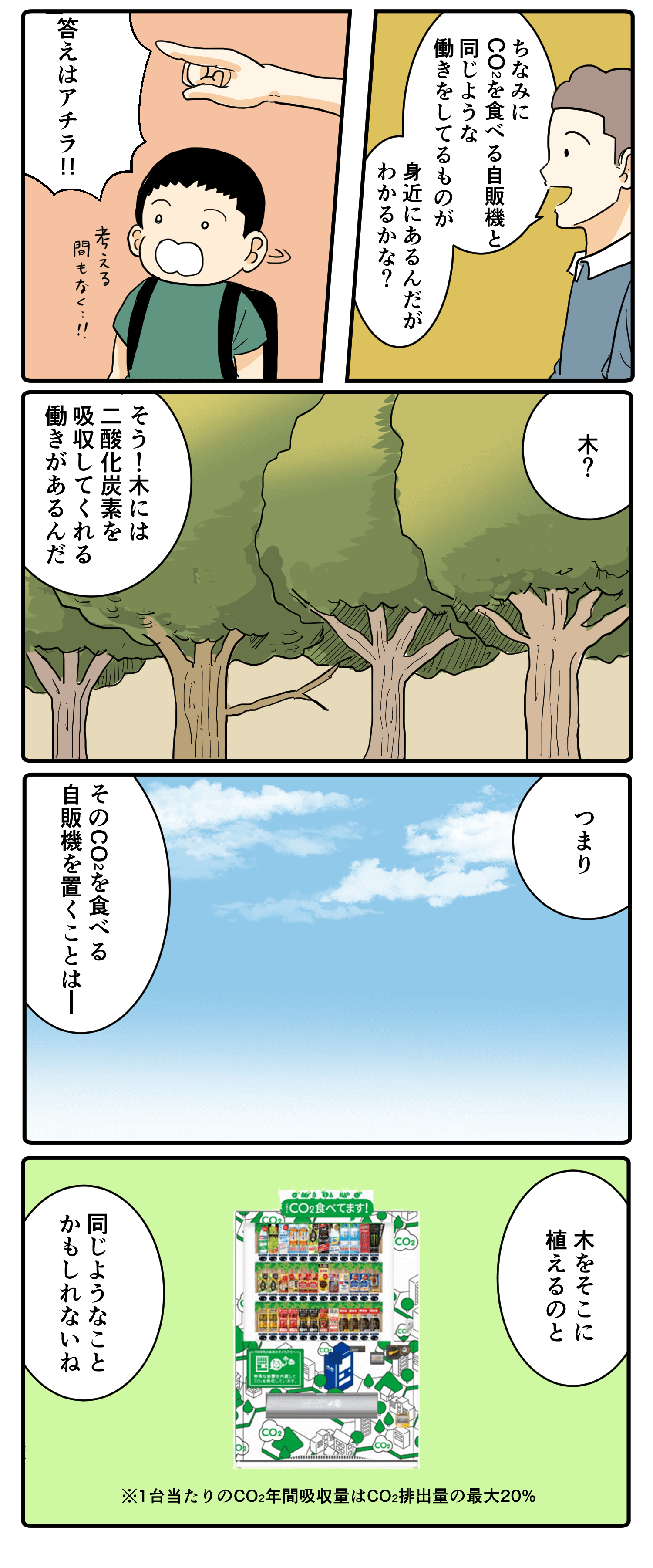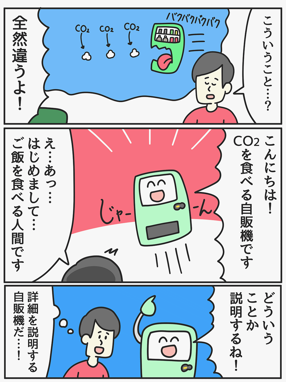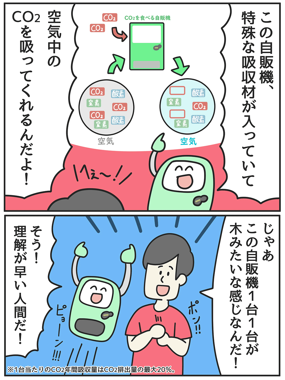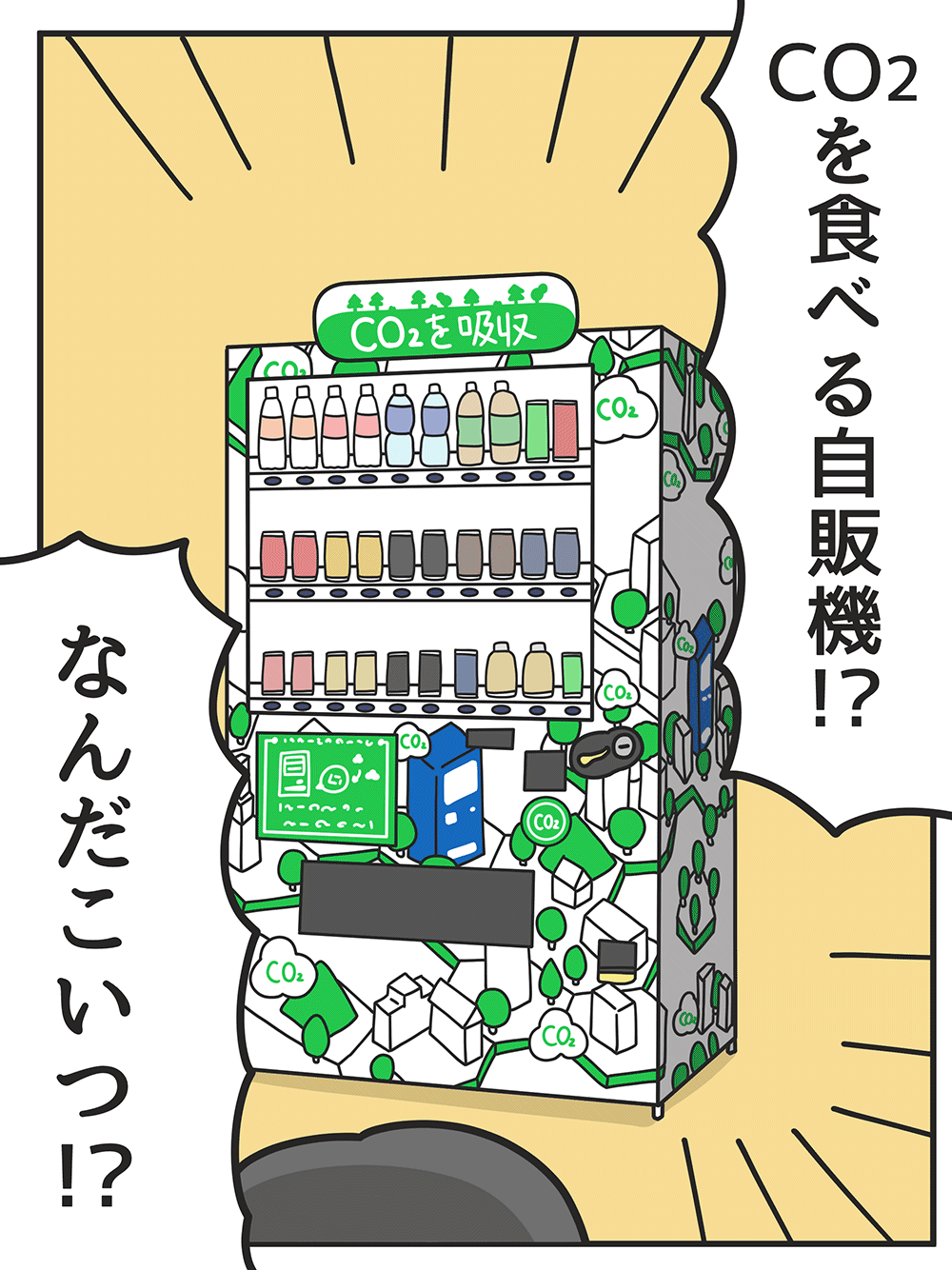 「CO2を食べる自販機」は、大気中のCO2を吸収する国内初の自動販売機です。周囲の大気からCO2のみを吸収する、いわば木と同じような役割を果たしています。「CO2を食べる自販機」を設置することで、都会に木を植え、森をつくるような取り組みとしたいと考えています。