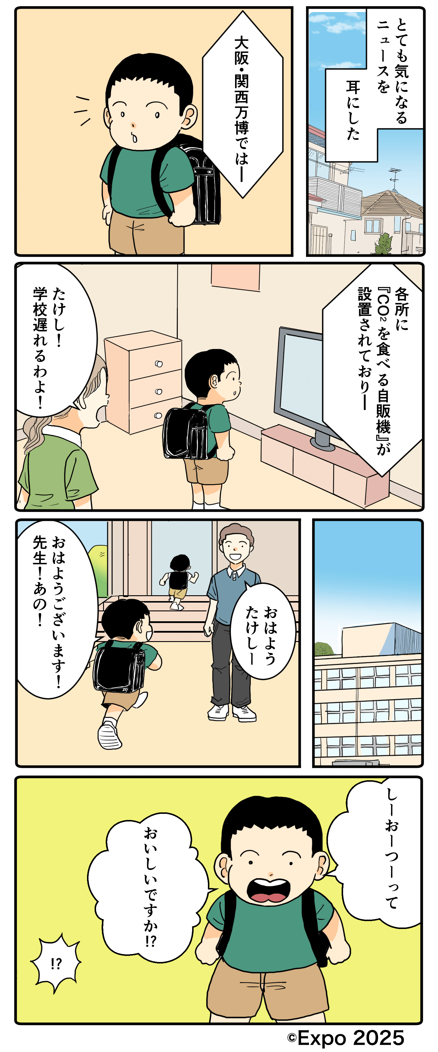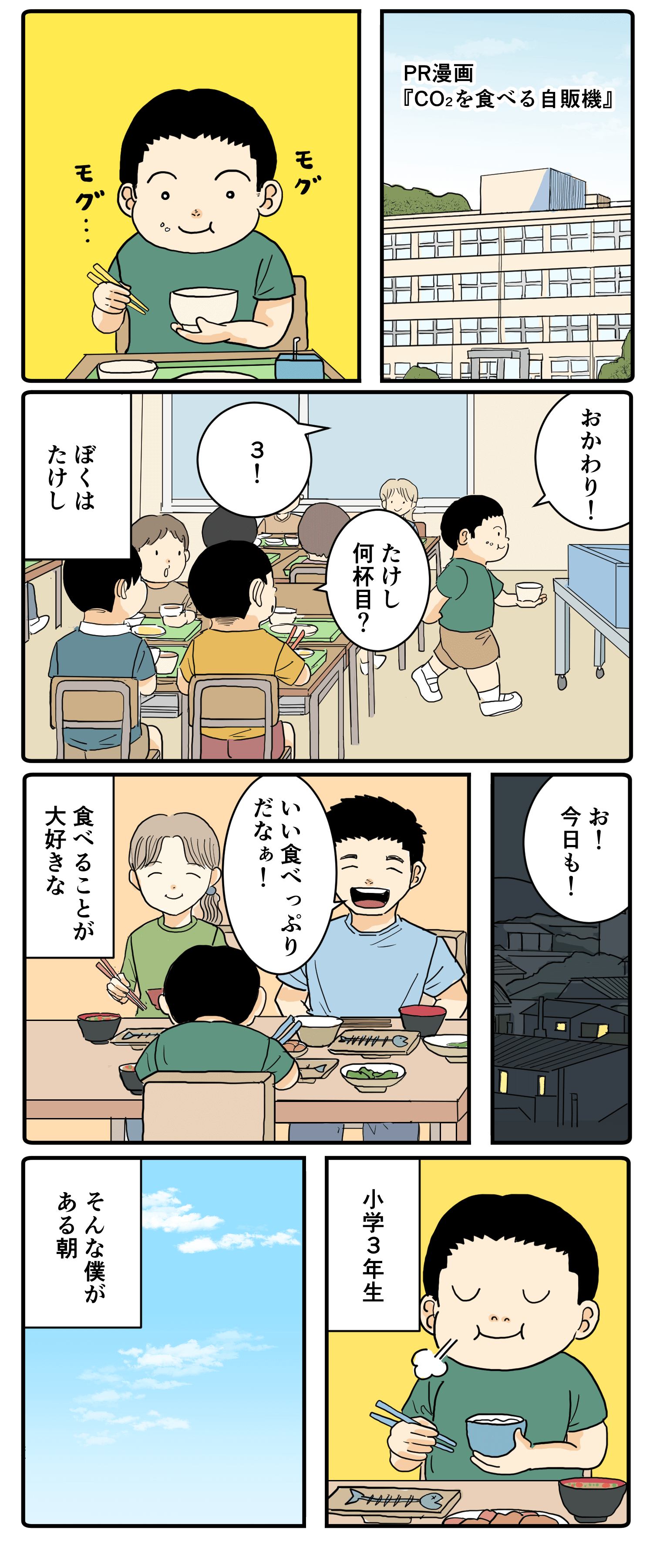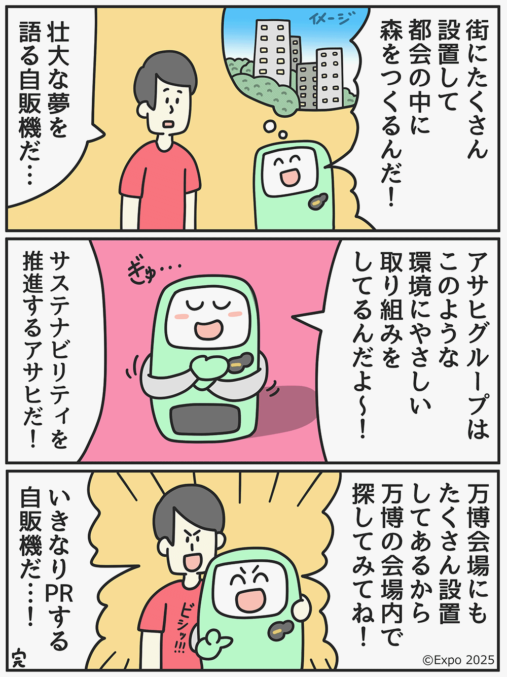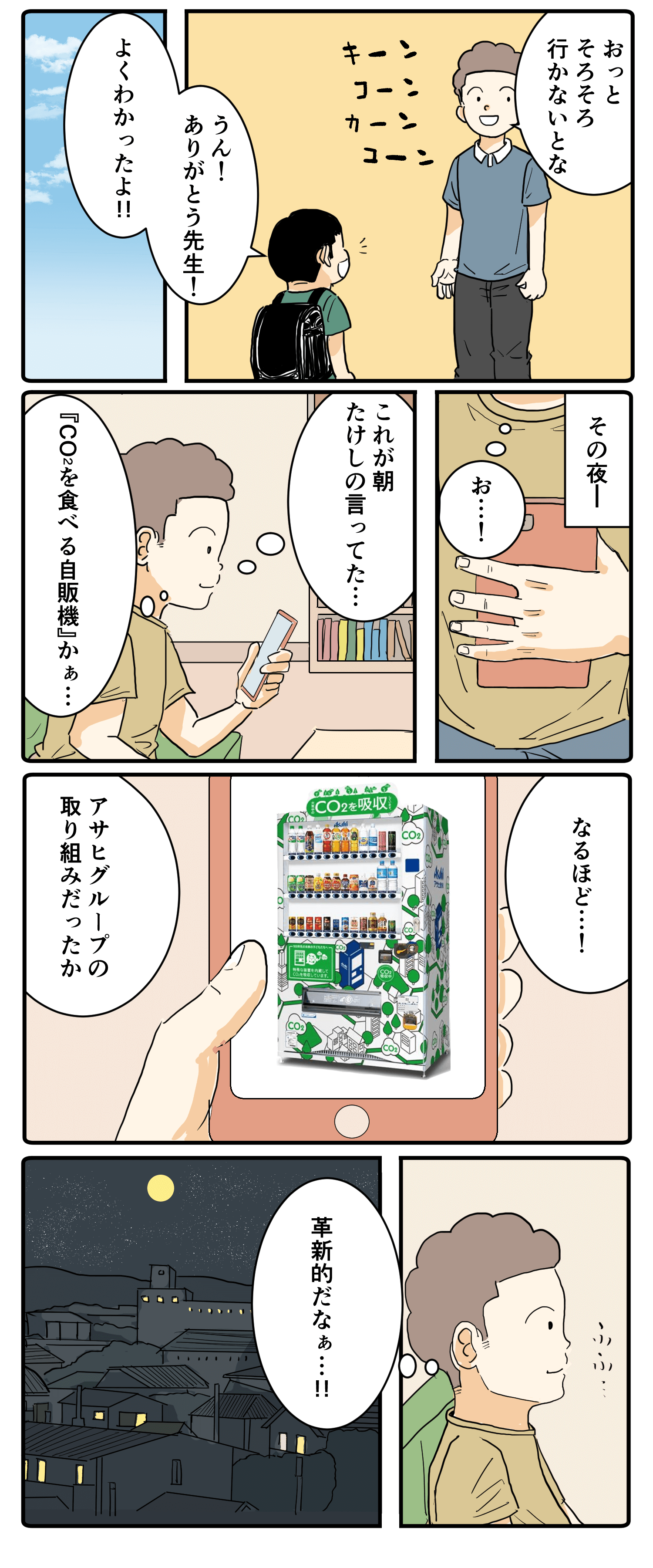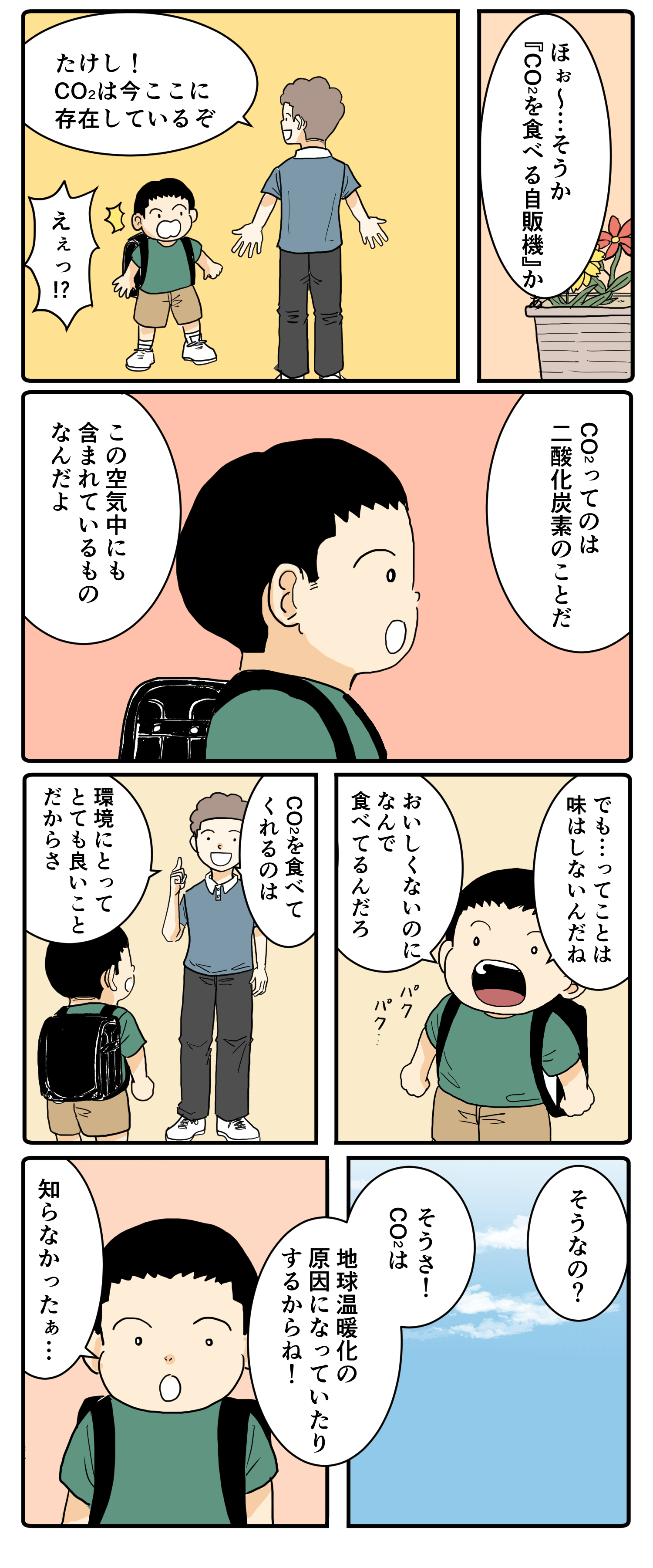 「CO2を食べる自販機」は、大気中のCO2を吸収する国内初の自動販売機です。周囲の大気からCO2のみを吸収する、いわば木と同じような役割を果たしています。「CO2を食べる自販機」を設置することで、都会に木を植え、森をつくるような取り組みとしたいと考えています。
