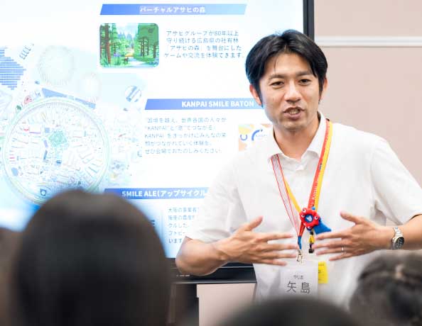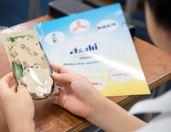 We visited schools to talk to students about efforts by the Asahi Group related to the Asahi Forest, which Group employees have been protecting for over 80 years. Through these efforts, we can help children, the generation that will lead the future, understand the relationship between forests and our daily lives, the importance of protecting forests, and similar topics.