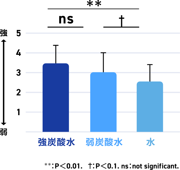 印象評定*1では、強炭酸水では刺激や爽快感が強く感じられ、炭酸水の摂取によりスッキリ感や爽快感が得られました。これらの特徴が眠気や気分の悪化(意欲の低下、リラックス度合いの低下)を防ぐ要因として考えられます。