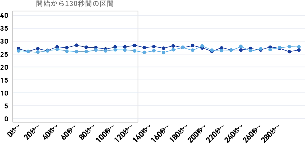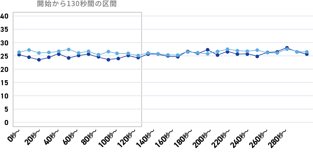 タイピング作業量の増加があった強炭酸水飲用後の0分〜5分の「ストレス度」の数値の変化を見ると、タイピング開始後130秒間の平均値は、