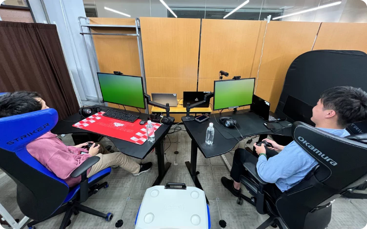 今回の実験では、筑波大学キャンパス内に対戦相手との物理的な空間共有の条件が異なる2種類のeスポーツプレー環境を用意。各被験者の表情を自動計測する機器も設置。